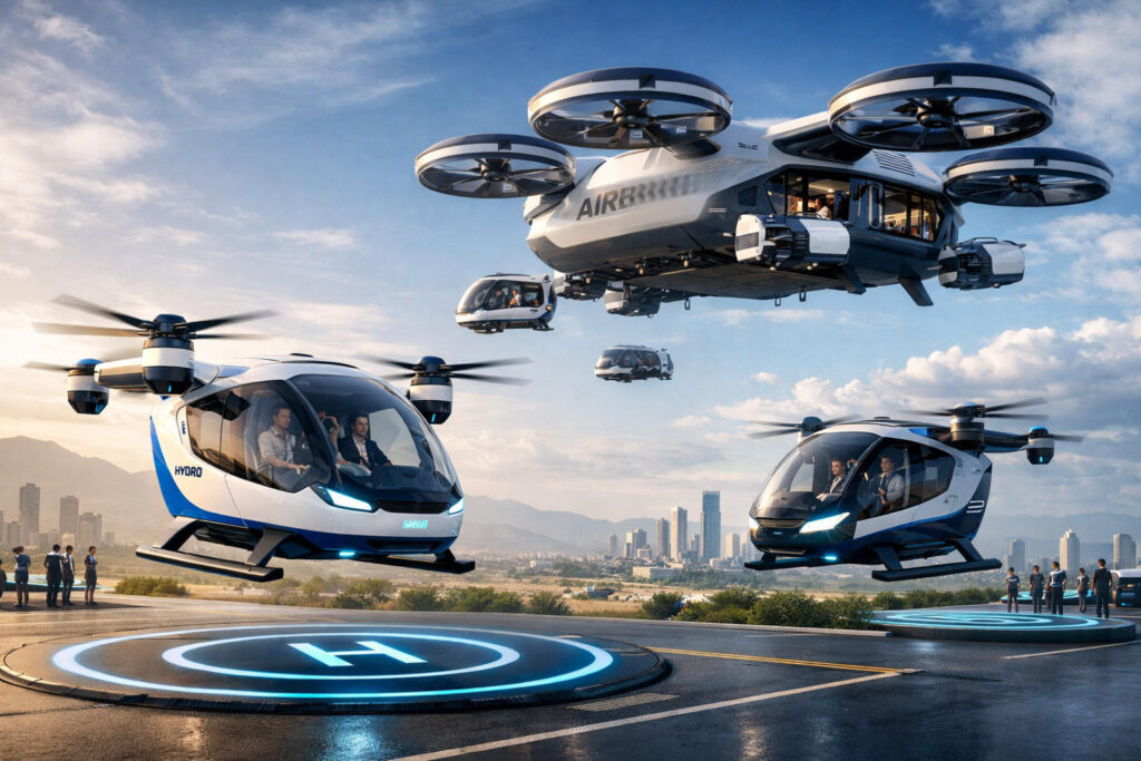 ChatGPT 2026-04 ein weiterer Versuch: generate a image: flying battery and hydrogen powered capsules that pick you up autonomously wherever there is a designated landingspot nearby and either directly fly you where you want to go (50km range) or deliver you to a bigger drone like ship that can go longer distances called an airbus (paints a picture with drones in background missing rotors)